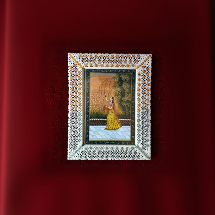 The Noor-e-Lykya™ Art Frame is a meticulously handcrafted bone-engraved masterpiece, inspired by classical Indian miniature paintings. Each frame is carved by skilled artisans using traditional techniques, creating intricate floral and geometric patterns that reflect heritage and precision.